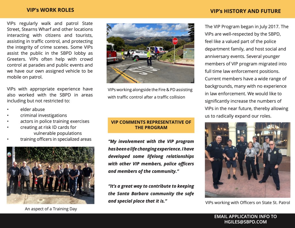 The Santa Barbara Police Department Volunteers in Policing (VIP) Program is accepting applications for interested community members wanting to volunteer their time at SBPD. Our current VIPs have different professional experiences, strong character, and a dedication to public service.