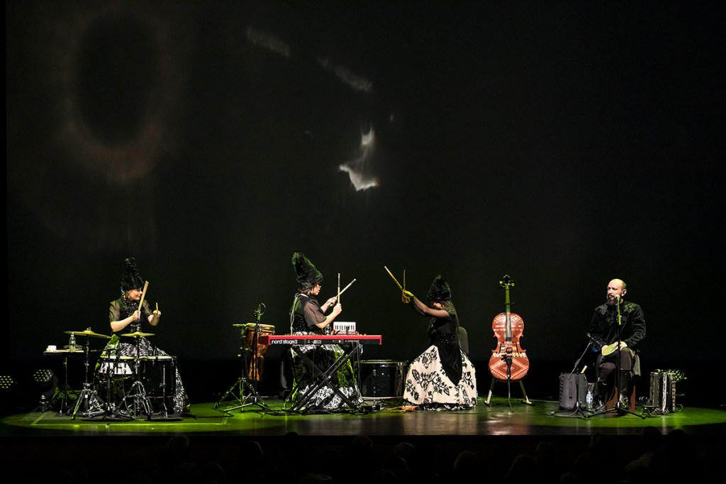DakhaBrakha, founded by theater director Vladyslav Troitsky in 2004 and steadily gaining audiences around the world, beguiled at the Granada, from top to bottom. Shifting from folkloric sounds to oblique art-pop and what can only be called “atmospherica,” the group features Marko Halanevych, vocalist and player of multiple western and indigenous Ukrainian instruments, and the vital female trio of Iryna Kovalenko, Olena Tsybulska, and Nina Garenetska, supplier of entrancing vocal harmonies and holding down the “rhythm section” function of drums, cello (doubling as bass), and occasional keyboards. A taut and intuitive rapport is clearly in check by now, many years and albums into the story.