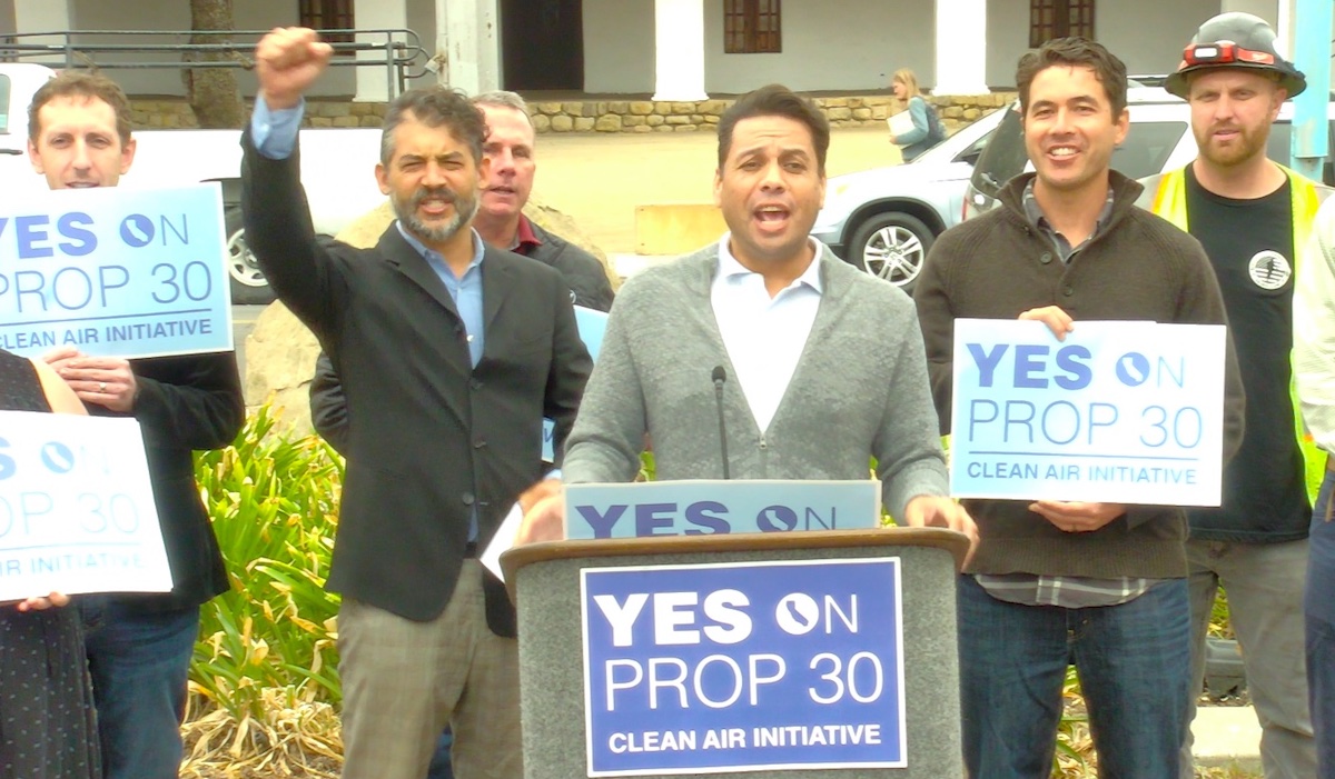 At De la Guerra Plaza on Thursday, Newsom’s critique prompted Max Baumhefner with the Natural Resources Defense Council to state that was a false claim. “There is no carve-out for Lyft in Prop. 30. It is not there. The opposition cannot find it because it does not exist,” he said, adding, “99.8 percent of the funding in Prop. 30 would go to Californians who have nothing whatsoever to do with ride-sharing companies.” Baumhefner said that eliminating tailpipe emissions had an additional benefit: “According to the American Lung Association, by tackling these emissions, we would avoid 15,300 premature deaths, 440,000 asthma attacks, and 2.2 million lost work days.”