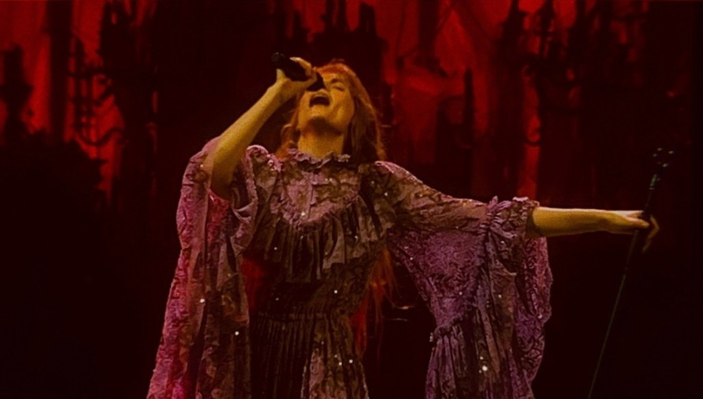 A gentle hymn begins as crystal chandeliers rise from the floor, and Welch floats onto stage, barefoot, in glistening lilac. She motions her arms and body singing “Heaven Is Here” as if her hands are dancing to it, seemingly swathing the audience’s attention around her with flowing ease.