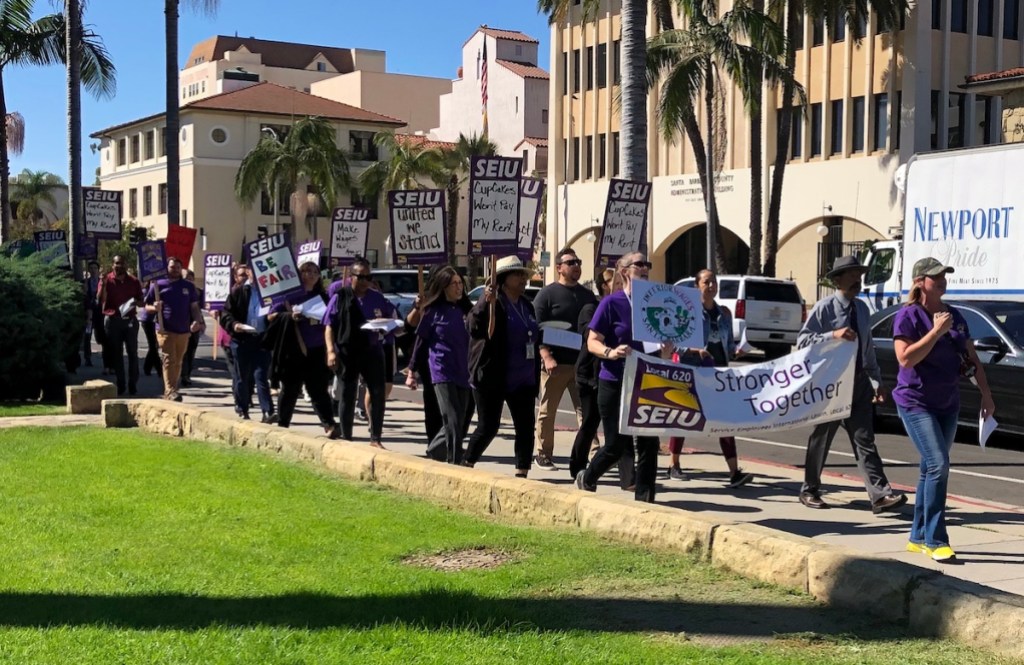 An aroma of pepperoni pizza drifted through the archway at the Santa Barbara courthouse as about 50 Superior Court employees gathered during their lunch hour to demand a new contract, specifically one that would raise their earnings to a living wage. As they marched out to circle the courthouse block, several munched on a slice, provided by their SEIU Local 620 organizers.
