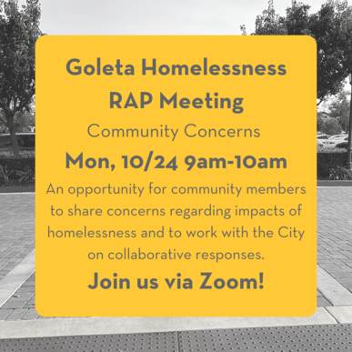 Please join the City of Goleta, Santa Barbara Alliance for Community Transformation (SB ACT), and CityNet next Monday, October 24, from 9:00 – 10:00 a.m. for a virtual meeting to discuss the Goleta Homelessness “Regional Action Plan.” Community members are invited to attend this monthly meeting to raise insights or concerns regarding the impacts of homelessness, and to work on collaborative responses.
