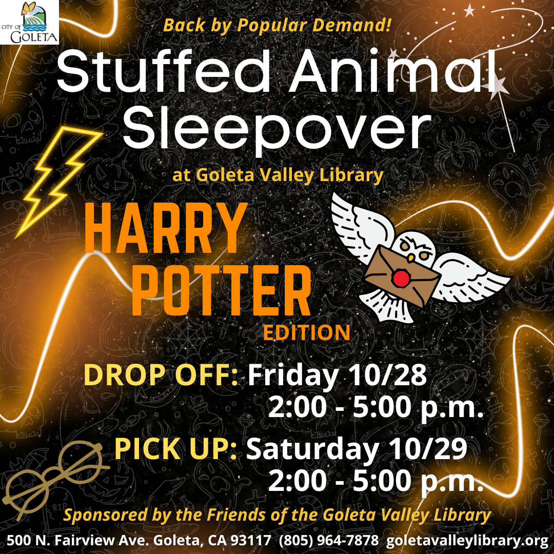 GOLETA, CA, October 21, 2022 – The Stuffed Animal Sleepover is back by popular demand, just in time for Halloween! Drop off your favorite stuffie at Goleta Valley Library’s Platform 9 ¾ on Friday, October 28th between 2:00 – 5:00 p.m. for an overnight adventure of Harry Potter-themed wizarding adventures. When you pick them up the next day on Saturday, October 29th between 2:00 – 5:00 p.m., you will receive an enchanting goody bag and keepsake photos of their magical visit to Hogwarts! Read on to learn more about this exciting event.