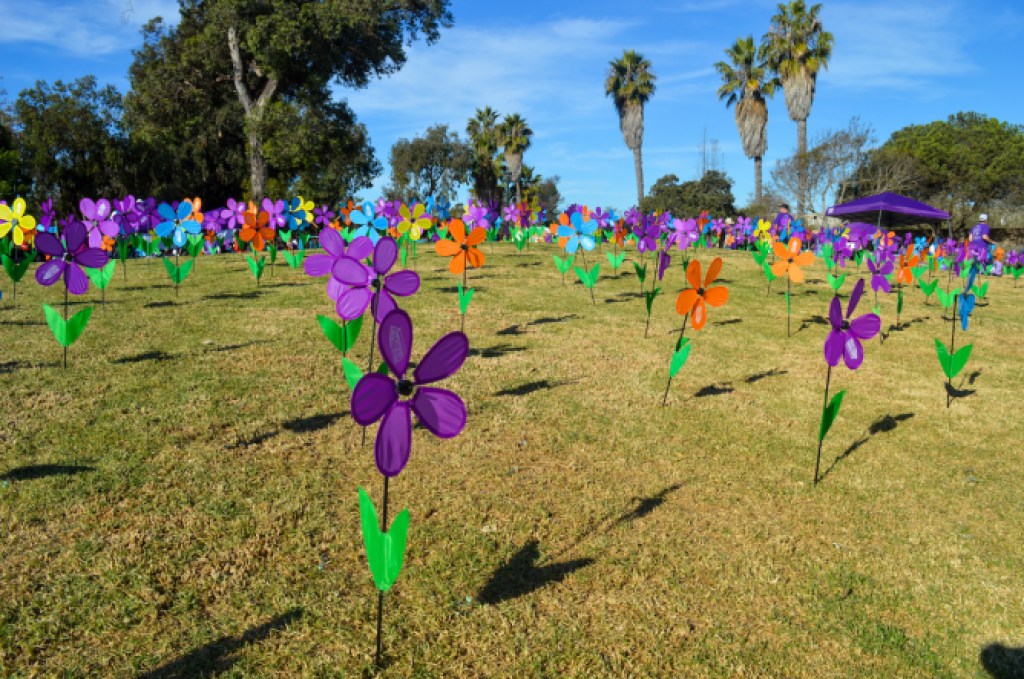 The lawn at Chase Palm Park was flowing with hundreds of flowers spinning in the wind, each color representing someone’s personal connection with the disease: orange for those who support Alzheimer’s awareness and research; yellow for those who care for someone currently living with Alzheimer’s; blue for those living with Alzheimer’s; and purple for anyone who has lost a loved one to the disease.