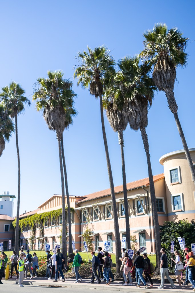 The sound of beating drums, hundreds of shuffling feet, and various impassioned chants such as “U-C-S-B — keeping us in poverty!” rang out across the UC Santa Barbara campus as a mobile picket line marched through the University’s grounds on Monday, marking the first day of the largest walkout in the history of U.S. higher education.