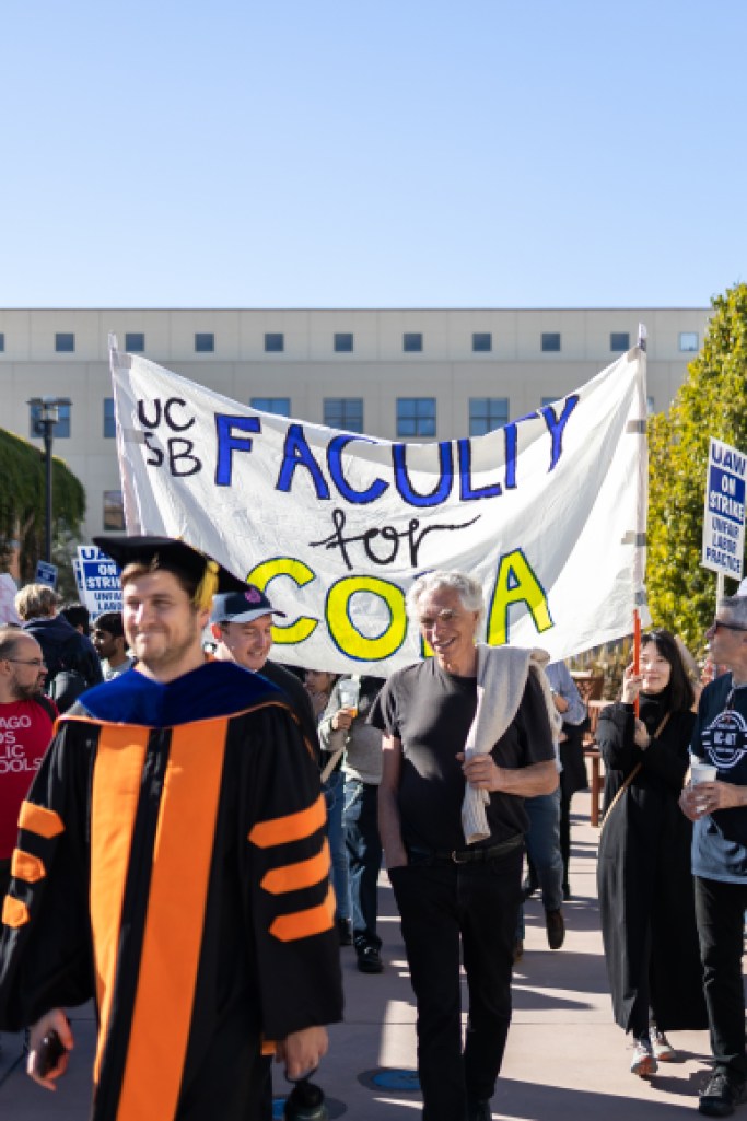 UCSB faculty also seems to be generally supportive of the strike, across the various disciplines. A group of professors and other faculty members dressed in regalia and holding signs in solidarity were greeted by their students as they marched alongside them.