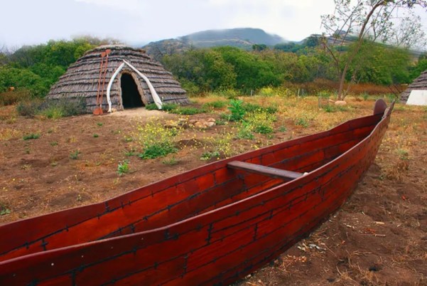 In the exposed cliffs below Kuyamu was a trickling stream of asphaltum, a great asset to that tribe. It was used for a multitude of things by all the Chumash villages, including the construction of their impressive watercraft, the Tomol. Their houses were described by European explorers as a half an orange with an open hole for chimney ventilation and light at the top. They were made of a frame of long poles, woven with grass and reeds, and an animal skin would be used to cover the hole during heavy rains.