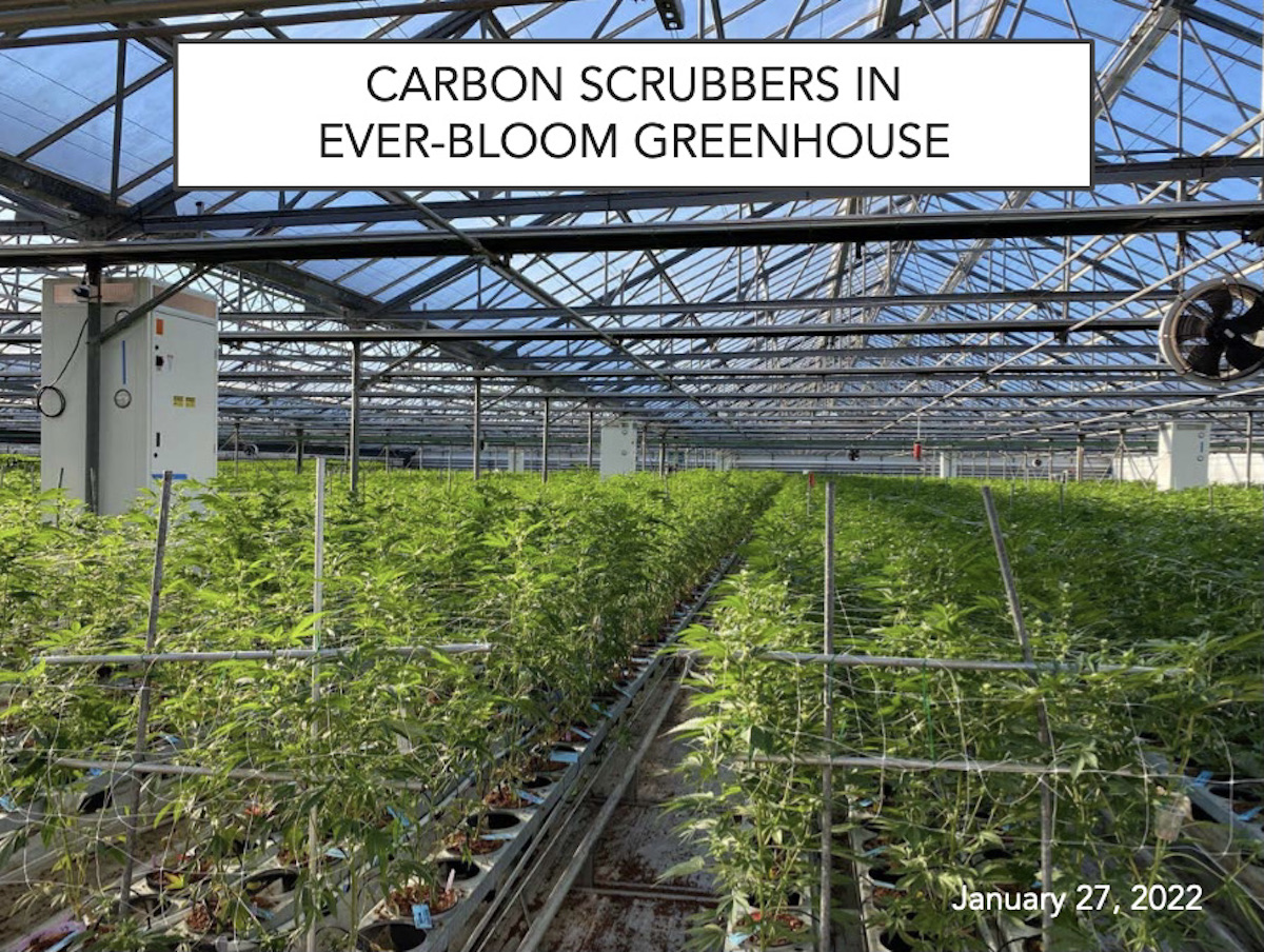 Ever-Bloom and Roadside Blooms are the only two greenhouse operations currently equipped with Envinity scrubbers. Neither uses a vapor-phase system. According to Greene, an additional 100 Envinity scrubbers will be installed early next year at Maximum Nursery, a four-acre cannabis operation at 4555 Foothill, and Creekside, a four-acre operation at 3508 Via Real. Both are owned by Ed’s brother, Winfred Van Wingerden.