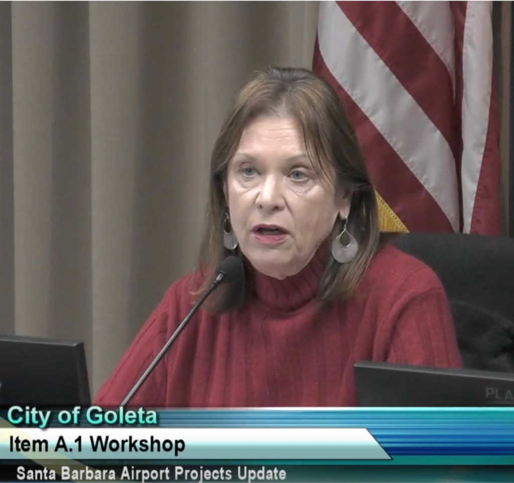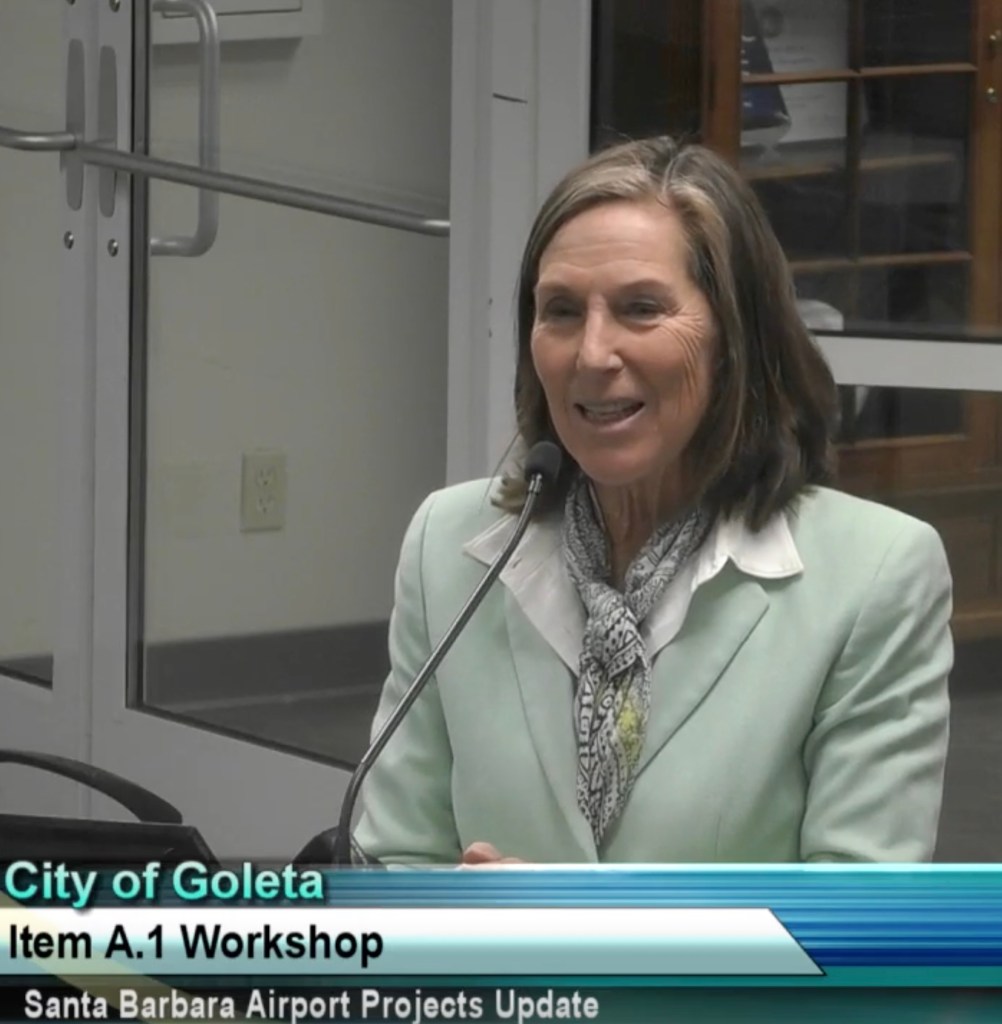 The 800-pound gorilla in the room was the Santa Barbara City Council, which appoints the Airport Commission members and runs the airport. Mayor Paula Perotte asked Hastert how Goleta’s rep could get voting status, which they currently do not have, referring to S.B.’s city charter. There, Section 812 states that public entities other than the S.B. council could appoint members who could be non-residents. Offering her support, County Supervisor Joan Hartmann spoke, saying aircraft noise was the number one complaint from her 3rd District constituents, who make up two-thirds of Goleta. Hartmann suggested that a Santa Barbara Channel program was a model for financial incentives and marketing advantages that could reduce problems — whale strikes and also air and noise pollution in the case of the Channel program, which asks tanker ships to slow their speed.