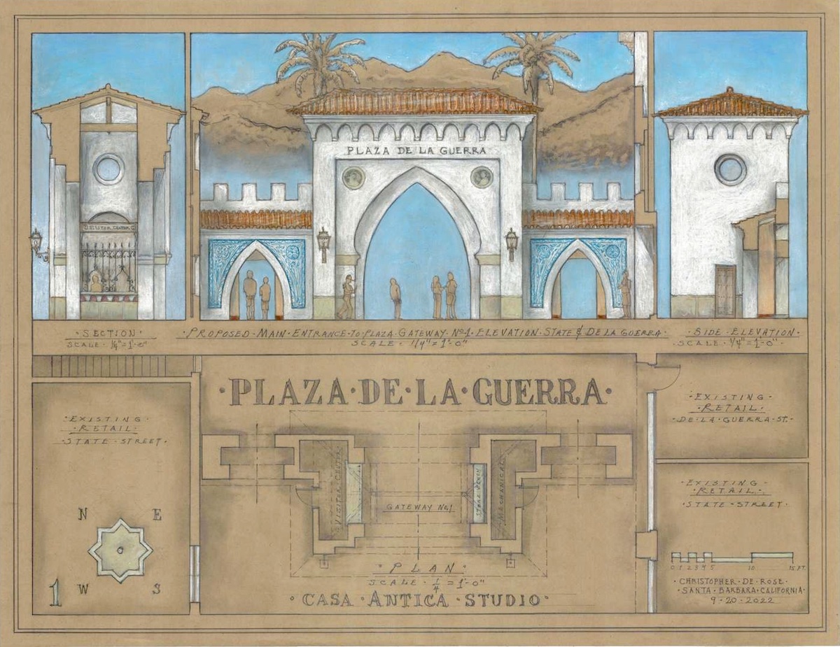 West Side of the Plaza: La Placita: 1925, Lionel H, Pries, Architect, built to replace the previous building destroyed in the earthquake. Much of what was originally proposed for this side of the plaza was never realized. And we have mostly the backs of the buildings that are on State Street. The proposed arched entrance into the Storke Placita and the single row of nine palm trees would greatly improve this side of the plaza. (See drawing of West Elevation and Longitudinal Section.)