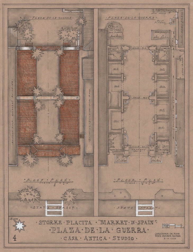 (2) Storke Placita or Spanish Market: This later addition to the plaza allows another outlet to State Street and never has been much more than a left-over space and a landscape mess. By introducing three large arches, a Spanish tunnel effect is created and frames the mountains at one end and frames State going the opposite direction. Sloped tile roofs are on both sides and four new restrooms are also located: two at State Street and another two at the plaza side. The small market stalls would be satellite locations for hopefully food vendors that produce their product elsewhere.