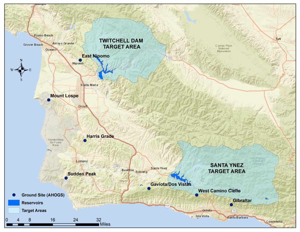 North American Weather will be targeting two watersheds — one in the Santa Ynez Valley upslope from Lake Cachuma, Jamison Lake, and the Gibraltar Reservoir, and the other upslope from Twitchell Reservoir.