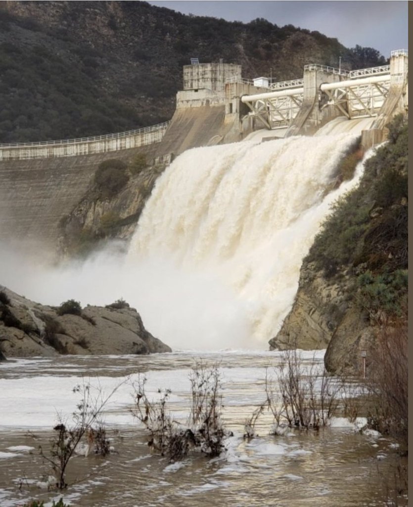 By Sunday, the current storm brought 3 inches to San Marcos Pass and 1.5 inches to Santa Barbara’s coast. Gibraltar and Jameson reservoirs are above 100 percent full, and Twitchell Reservoir outside Santa Maria grew from 29 to 40 percent full in the past 24 hours, an addition of 22,000 acre-feet. (Each acre foot is 325,000 gallons of water.) Since Friday, Lake Cachuma rose by a foot — adding 2,098 acre-feet, or 6 million gallons — but is receiving less runoff than before. The release from the spillway, originally set for Saturday, is on hold at the moment, according to Bureau of Reclamation spokesperson Mary Lee Knecht, as they evaluate the current storm’s runoff.