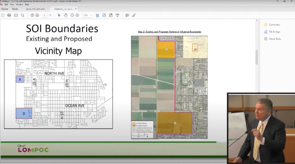 No less than former state senator Bob Hertzberg made a pitch for Lompoc to the commissioners, made up of six elected officials and public member Shane Stark, formerly Santa Barbara’s county counsel. Hertzberg helped write the bill that formed LAFCO agencies in California: the Cortese-Knox-Hertzberg Act. As the name implies, a Local Agency Formation Commission guides the creation of new government entities, like cities or special districts — and the law includes a specific directive to avoid urban sprawl.