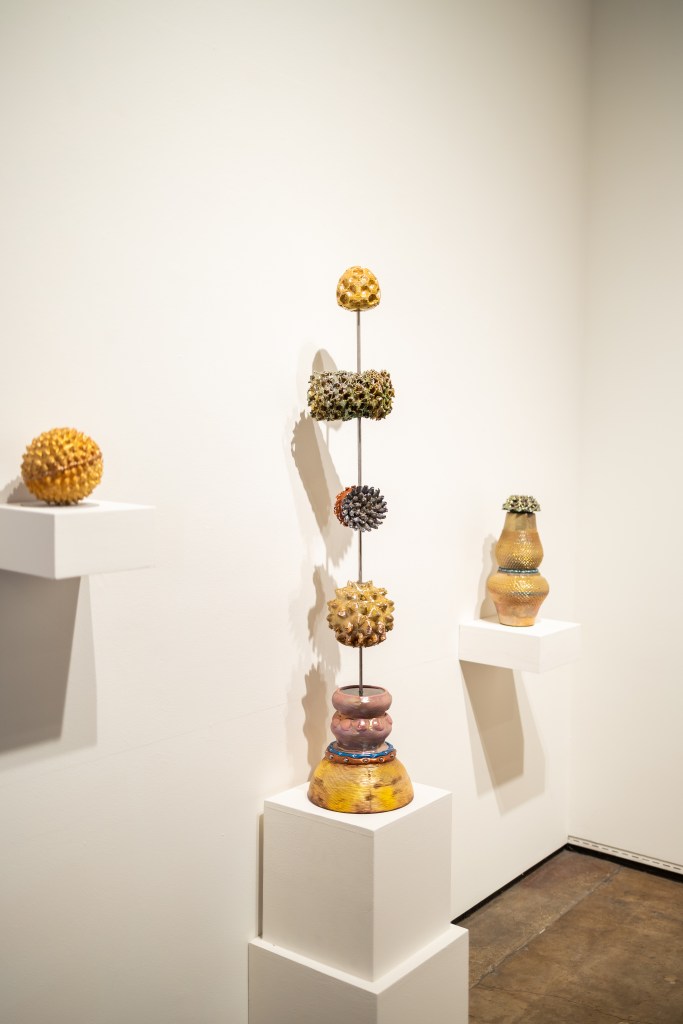 We see your fanciful imagination at work in pieces with titles like “Curvaceous Apothecary,” “Atomic Linen Table,” and “Mystic Pillow Talk.” Is there a characteristic Lynda Weinman sense of humor, and if so, how does it show up in the pieces on display at Sullivan Goss? I enjoy incorporating humor in my work and find naming my pieces to be a fun challenge. I often choose words that evoke the meaning of the pieces, even if they are intentionally mismatched. I have been working on a series of trippy apothecary jars for over a year, some of which are featured in the Sullivan Goss show. The “Atomic Linen Table” is inspired by the 1950s motif, reminiscent of an atomic symbol, and evokes the look of spun-gold silk linen. The “Mystic Pillow Talk” is a contradiction, as clay is not soft, but the shape sits like a pillow inside another pillow and they “talk to each other.” Each name I choose has a story behind it.