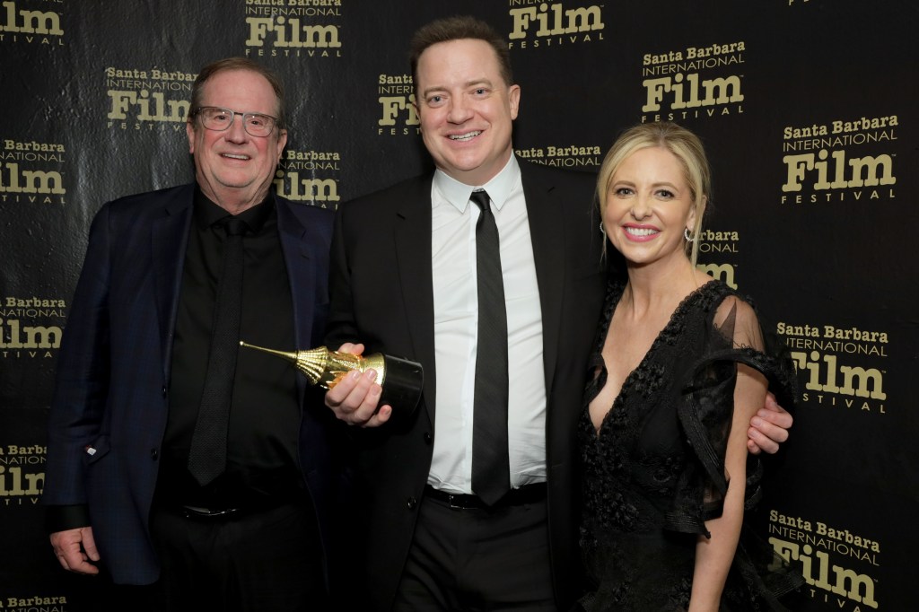 (L-R) Pete Hammond, honoree Brendan Fraser, and Sarah Michelle Gellar pose with the American Riviera Award during the 38th Annual Santa Barbara International Film Festival at the Arlington Theatre | Credit: Rebecca Sapp/Getty Images for SBIFF