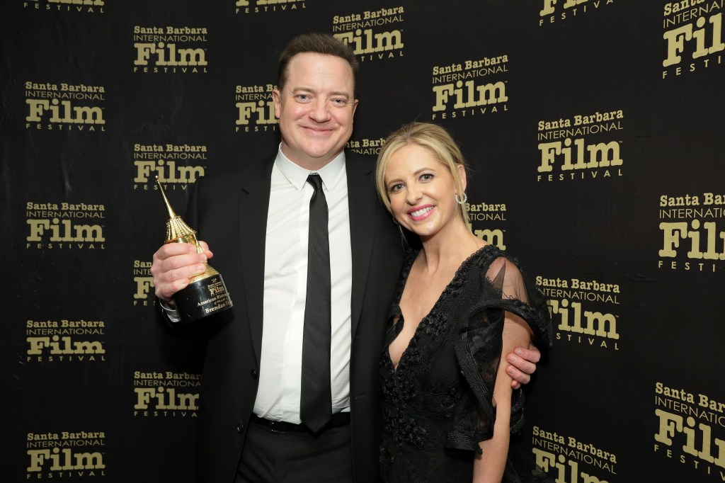 Sarah Michelle Gellar (R) presents Brendan Fraser (L) with the American Riviera Award onstage at the American Riviera Award Ceremony during the 38th Annual Santa Barbara International Film Festival at the Arlington Theatre | Credit: Tibrina Hobson/Getty Images for SBIFF