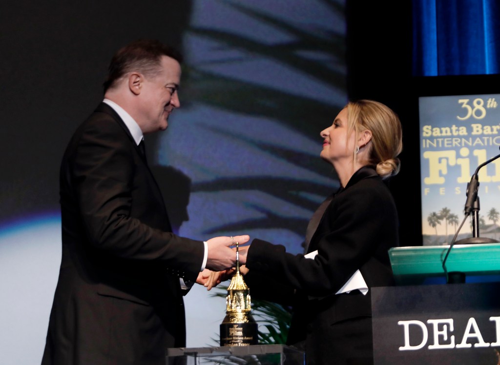 Brendan Fraser receives the American Riviera Awardonstage at the American Riviera Award Ceremony during the 38th Annual Santa Barbara International Film Festival at the Arlington Theatre | Credit: Tibrina Hobson/Getty Images for SBIFF