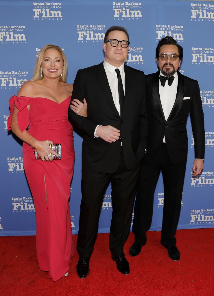 (L-R) Jeanne Moore, Brendan Fraser and Roger Durling attend the American Riviera Award Ceremony during the 38th Annual Santa Barbara International Film Festival at the Arlington Theatre | Credit: Tibrina Hobson/Getty Images for SBIFF