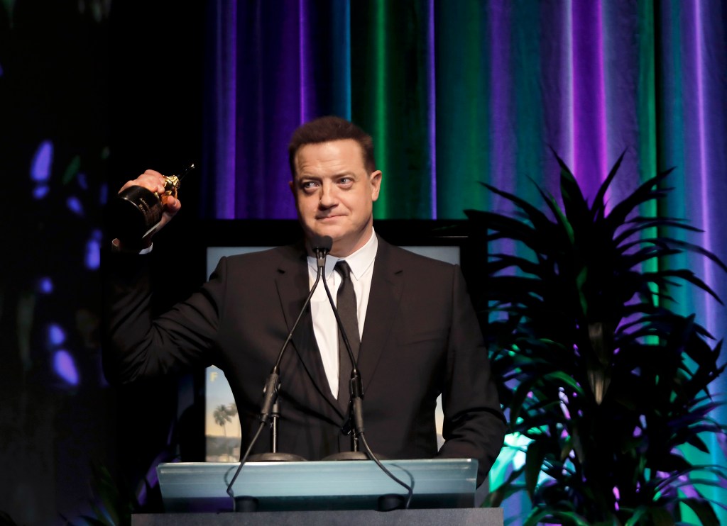 Honoree Brendan Fraser poses with his American Riviera Award during the 38th Annual Santa Barbara International Film Festival at the Arlington Theatre | Credit: Rebecca Sapp/Getty Images for SBIFF