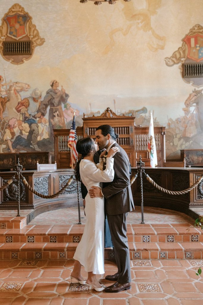The Santa Barbara County Courthouse is a drop-dead stunner of a location and a one-stop shop for elopements. Angeleno Maggie Moon Berwick and her now-husband, Stuart, were attracted to the Santa Barbara County Courthouse for their January 11, 2023, elopement because of its sense of place. “It’s such a dreamy place inside and out,” she recalled. The couple made their own arrangements, securing a reservation a few weeks ahead of time, and found the experience to be incredibly smooth and positive. “Everyone was so warm and sweet; you could tell they weren’t just going through the motions and really cared.”