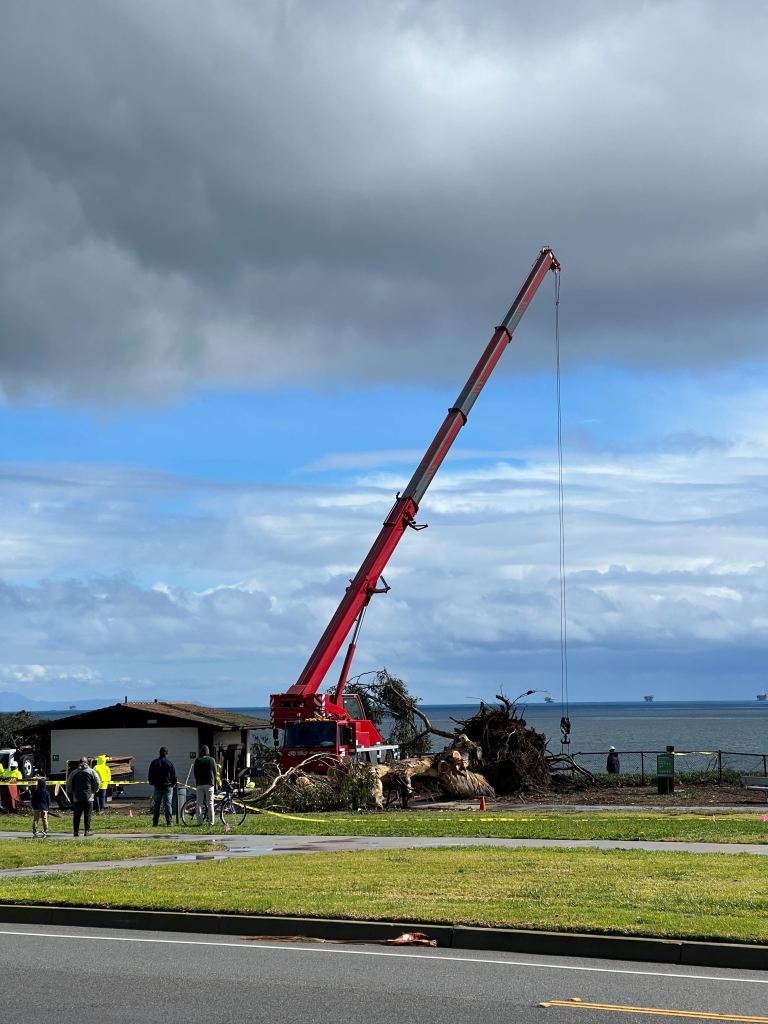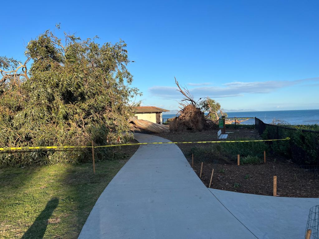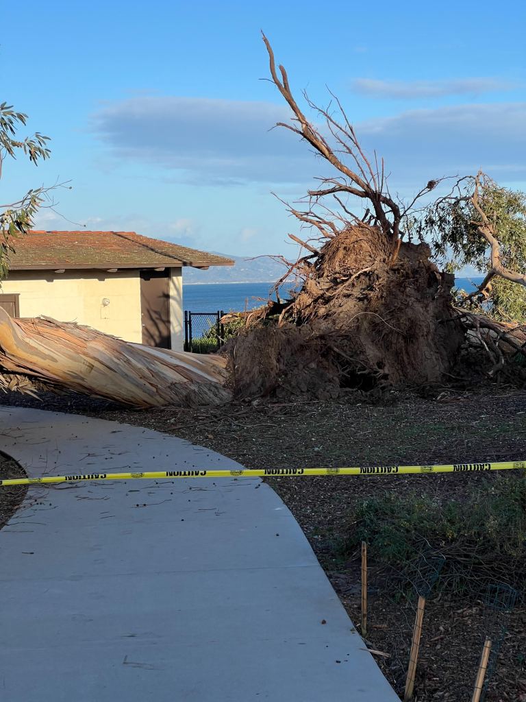 Reader Ellen Meaney sent the Indy photos of the giant eucalyptus trees at Shoreline Park that fell over during the high winds on Wednesday afternoon. One went over the cliff, Parks & Rec said, while its mate — their roots were tangled together — fell into the park. No one was injured.