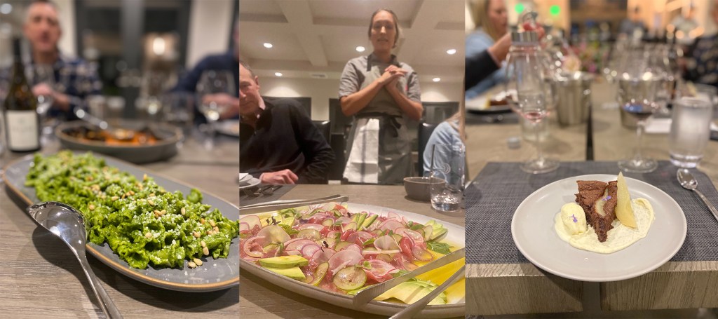 For dinner that evening, I made my way to Center of Effort, where I toured the cellar with assistant winemaker Kevin Bargetto, whose dad and uncles I know from Bargetto Winery and Soquel Vineyards up in Santa Cruz. Our eventual destination was Center of Effort’s sleekly designed hospitality center, where Chef Lindsey Morin was preparing a multi-course, family-style feast in the open kitchen. Also joining us were winemakers Steve Dooley of Stephen Ross Cellars, Fred Delivert of Tolosa Winery, Shanna Vanderstoel of Cadre Wines, and Coby Parker-Garcia of El Lugar Wines.
