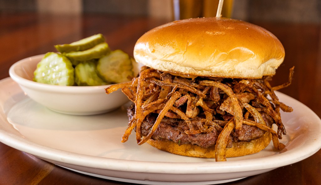 The burger is familiar in all the right ways: a soft sesame-seed bun, third-pound patty, grilled onions, cold lettuce, tomato, pickles, American cheese, and Thousand Island dressing. Yet it’s the peppercorn aioli that weaves each component together into a hearty bite. The same occurs on the vegetarian version, whose Impossible patty is expertly charred, truly challenging the beef experience. Add in shatter-crispy onion rings or crunchy fries, plus a freshly drafted ale to wash it down.