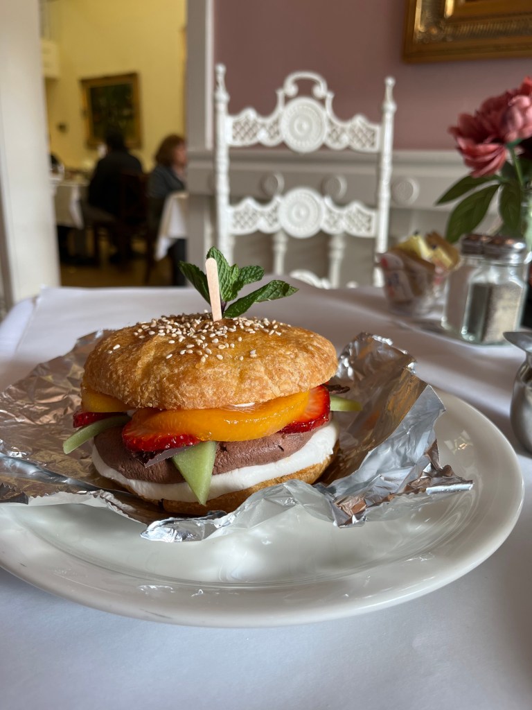 If Willy Wonka made pastries instead of gobstoppers, and maybe if he teamed up with the Mad Hatter for a nothing-is-what-it-seems tea party treat, they’d invent something like the Dessert Burger. Lucky for us, when it comes to kitchen creativity, Charlotte Andersen — owner of Andersen’s Danish Bakery & Restaurant — possesses just as much fun and whimsy as those two (but without all the psychosis) and developed this showpiece herself.