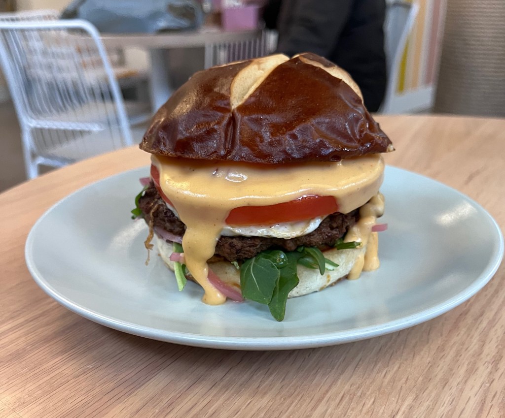 In this case, their Pretzel Pub Breakfast Burger is a riff on the popular smash burger, with their house-made patty topped with a variety of toppings and textures: perfectly sliced pickled red onions; a thick, juicy, heritage-style tomato slice; arugula; tangy beer-cheddar sauce; a little grain mustard; and an ooey gooey fried egg — all on a soft, chewy, salty pretzel bun!