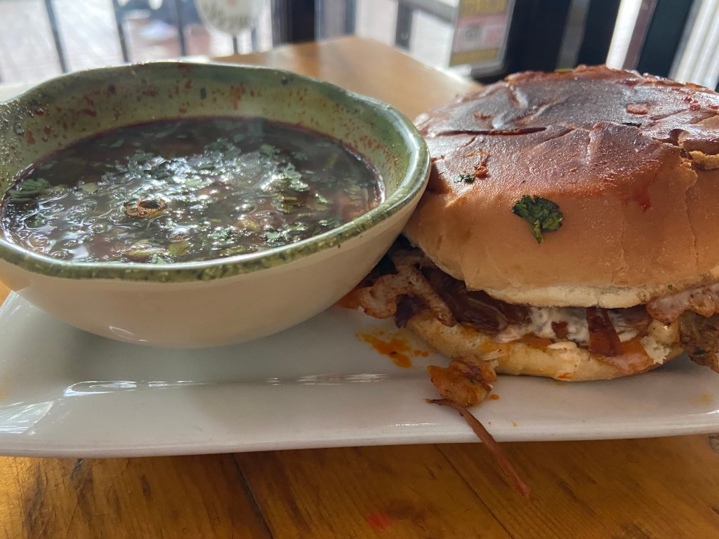 “We specialize in it every day,” Estrada said proudly. For Burger Week, he’s loading that perfectly cooked birria into a toasty, cheesy bun, and topping the meat with more melted cheese, cilantro, red onion, and a drizzle of a creamy chimichurri. One bite of this comforting creation hit all the right notes, but a dip into that steamy consommé served on the side took things to another level of harmonious flavor. Don’t forget to grab a cool, creamy house-made horchata to elevate the experience. —Rebecca Horrigan