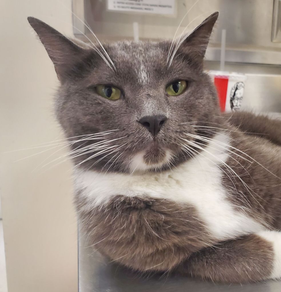 Matthews is a male 12-year-old short-haired gray and white cat. This adventurous boy loves attention. He spends a lot of his time supervising shelter volunteers, assisting staff with their work, and making sure that you notice him.