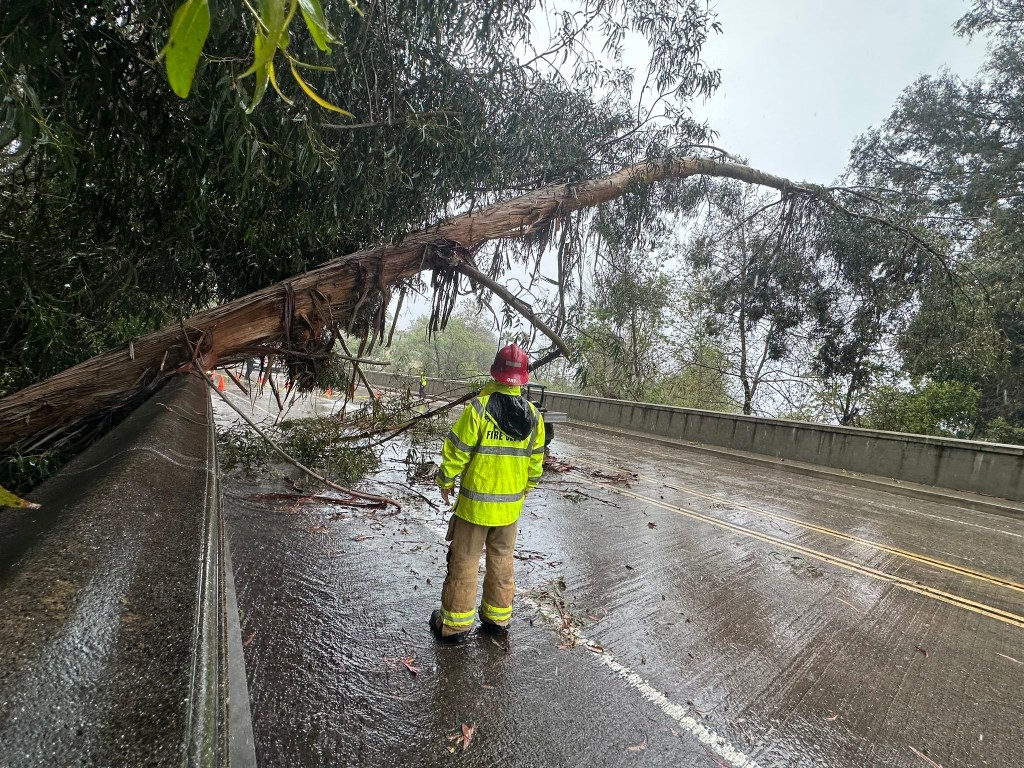 Santa Barbara County firefighters on Tuesday responded to a hundred-foot eucalyptus tree that fell onto Goleta’s Calle Real amid a rainstorm that has triggered evacuation orders, school closures, and flood warnings across the county.