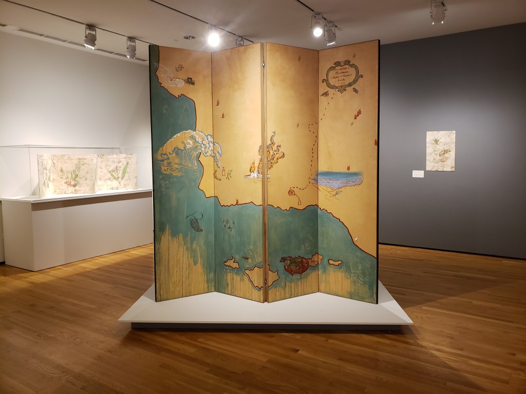 As an impressive literal centerpiece of the show, “Mapa of Resistance & Revolt in Central Califas,” Rodriguez’s large accordion-style folding screen in the Japanese byōbu tradition fills the center of the museum’s back gallery. Described as an “anti-colonial map,” the screen’s central image finds Santa Barbara’s “Queen of the Missions” engulfed in flames, a metaphorical depiction of the Chumash revolt, one of the boldest efforts of Native American fighting back against the mission system’s program of semi-genocidal invasion and enslavement, on the eve of its bicentennial.