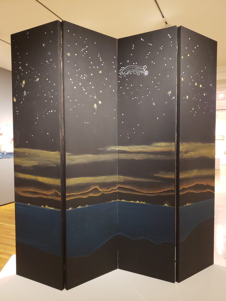 On the reverse side of the screen, we see Santa Barbara from the dreamy nocturnal perspective of Santa Cruz Island, originally a Chumash village known as Limuw, a sacred site in tribal heritage and folklore.