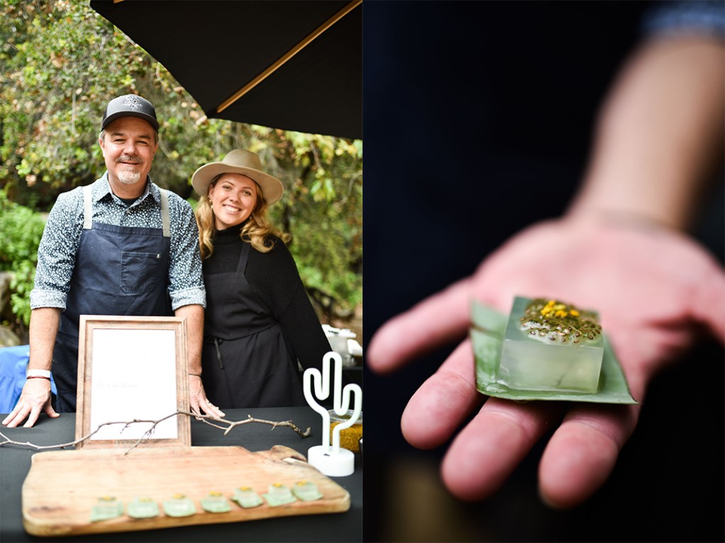 Hearing that you could source creek water for recipes, Tummel actually captured fresh rain, stabilized it in a seaweed-based gelatin, and then enhanced the transparent mold with chia seed, honey, and wood mint, a native plant growing just feet from his booth. He called the creation “Box of Rain” — one of my favorite Grateful Dead songs, incidentally — and served it on a banana leaf.