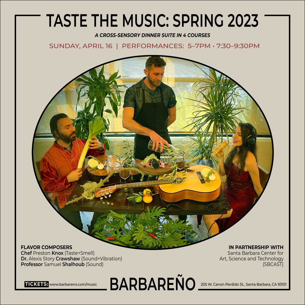 With two seatings from 5-7 p.m. and 7:30-9:30 p.m., this one-of-a-kind experience is co-presented by the Santa Barbara Center for Art, Science, and Technology (SBCAST). Visit barbareno.com/music for information and tickets.