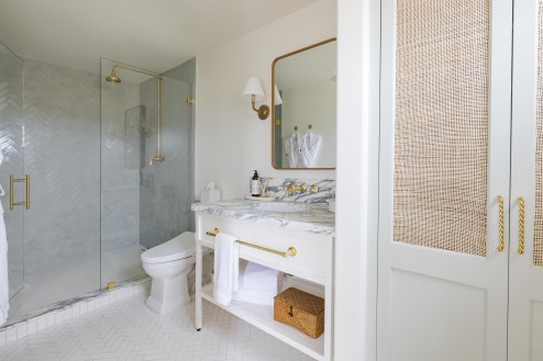 The room itself complemented the beachy surroundings, appointed with shades of sage green, blue, and earthy accents — think blonde hardwood floors, rattan lamp shades, and a creamy marbled minibar cabinet. The luxurious bathroom was one of my favorite features — heated tile floors and a warming Japanese bidet, yes please!