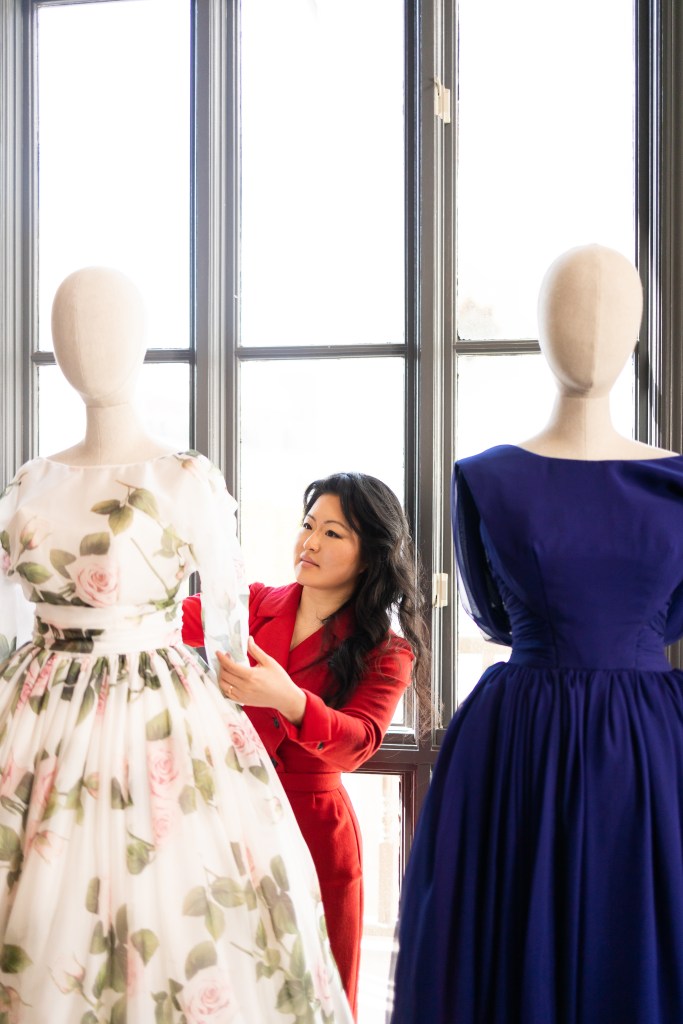 The coronation gown to be displayed is silk taffeta with a gold ribbon stripe that’s running through it. Austine says Hartnell designed a lot of the British royal gowns and dresses using those colors. “And then we have the robe, which will be made from silk velvet. And what’s interesting is a lot of historical texts will call the color of the robe crimson or red. But I actually found this coronation butterfly that was made from scraps of the original coronation robes and was able to color-match that. So it’s actually more like a maroon.”