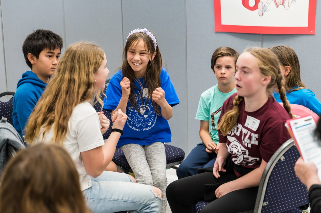 Small clusters of 4th-6th grade students filled the Santa Barbara County Education Office’s auditorium on Thursday, April 27, for the team elementary battle. The sound of quiet brainstorming sessions echoed around the room, juxtaposed by answers shouted out excitedly by group leaders holding personalized, hand-crafted shields displaying their team name.