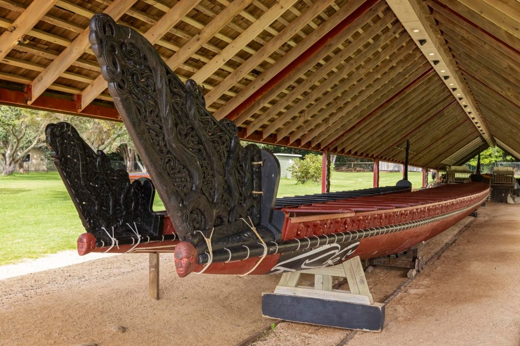Following in the wake of the cyclone, our shifting itinerary still includes a visit to the North Islands Bay of Islands and the site of the Waitangi Treaty Grounds. Our Māori hosts escort us over grassy slopes. We stop to see the world’s largest ceremonial waka, a war canoe intricately carved and painted for the centenary of the Treaty of Waitangi’s signing in 1940, then renovated in 1974 for Queen Elizabeth II’s visit to Waitangi. We pass by the Te Kongahu Museum of Waitangi, and the Price of Citizenship Museum. Arriving at the meeting house, Māori performers greet us with a powhiri, a booming welcome, before inviting us inside the Te Whare Rūnanga for a Kapa Haka cultural performance. I recall Sienna’s suggestion that before embarking on the Orion we visit the War Memorial Museum and Toi o Tāmaki, the Auckland Art Gallery for their outstanding, informative displays of Māori arts and culture. It gives me a sense of context for what I see now at Waitangi. At Waitangi, this space is similar in intention to the Te Marae Atea Māori Court at the Auckland War Memorial Museum, but populated with dancers, singers, and guests. In both spaces I respectfully remove my shoes and enter.
