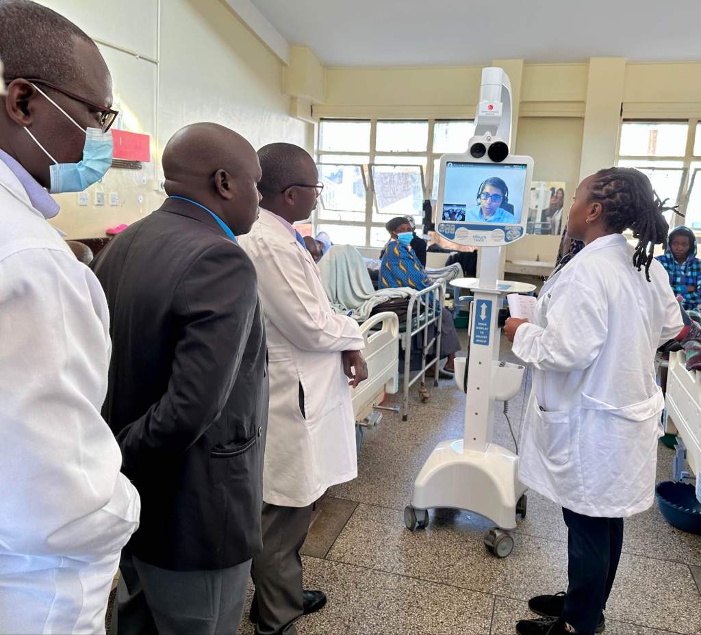During a recent visit to Kenya, Allen saw a single robotic device wheeled up and down in a multi-floor hospital. “We’re in the labor ward, with OB-GYN consulting, and then we’re in a ward where there’s a neurological problem … and they go to the lecture hall, and a provider’s giving a didactic session on ischemic stroke.” She describes seeing maternity wards with “two random mamas and two random babies all in one bed,” and asking the women if they knew each other. “And they’re like, ‘We do now.’ ”