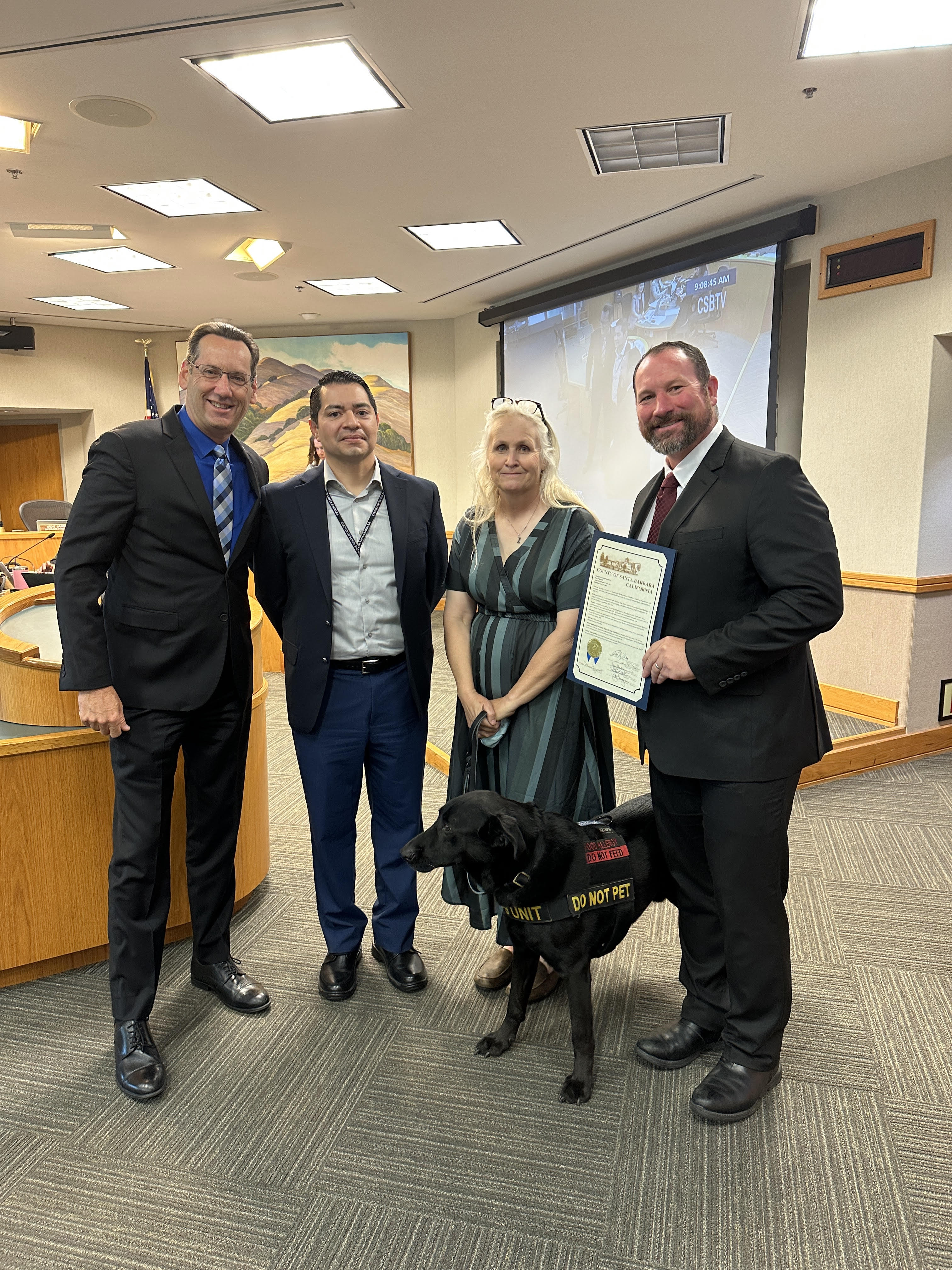 “Doomis,” a Labrador agriculture inspector, received official commendation from the Santa Barbara County Board of Supervisors on Tuesday morning for his long and successful career. In a final demonstration for the board, Doomis quickly sniffed out suspicious packages, alerting his handler, Christine Tyler, with paw scratches. Doomis has signaled an alert on 43,000 agricultural parcels with an accuracy rate of more than 94 percent, intercepting 550 pests.