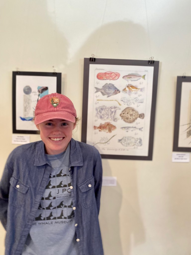 The first place winner of the show, Lucy London, described her watercolor painting, The Diversity of Fishes, in a sentiment that integrated a sense of climate-anxiety with a push for environmental activism, noting, “…it’s come to my attention that even incredibly biodiverse marine regions (like the Santa Barbara Channel) are under threat from human impacts. This piece is inspired by a statistic that I heard, which said that ‘by 2025 there will be one ton of trash in the ocean for every one ton of fish.’ In order to communicate this fact to people, and hopefully inspire them to change, I made a piece styled after old encyclopedia pages, but had about half of the ‘fish’ pictured actually be trash. Our oceans, though vast, are struggling, but it’s not too late to save them.”