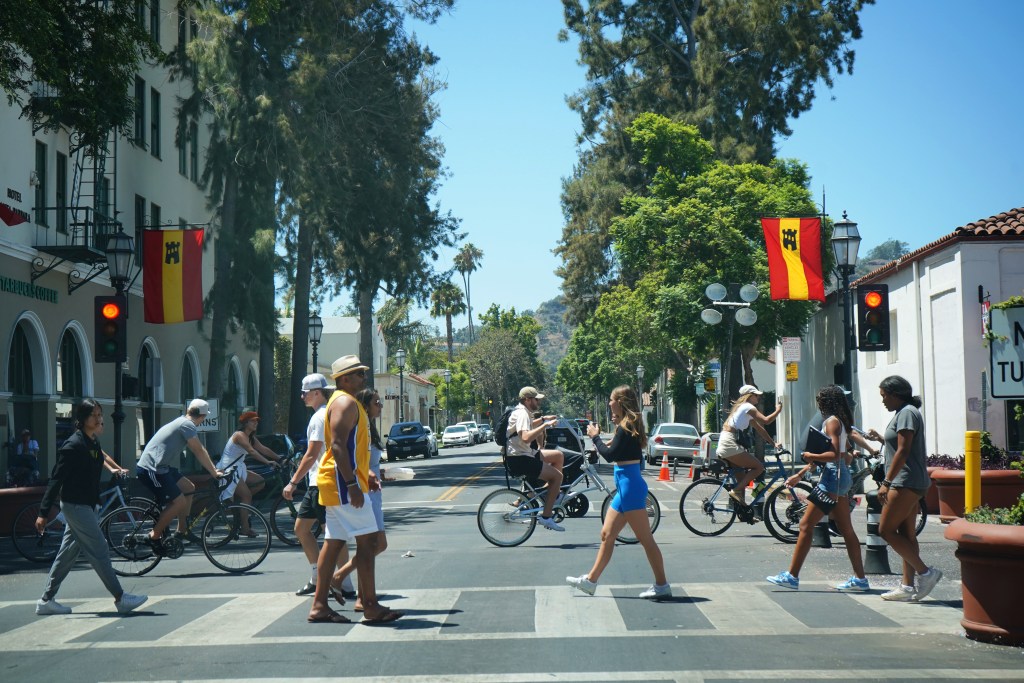 Two ancillary observations: to date, there has been no appreciable, observable effort by any of the powers-that-be to rein in the problem of e-bike riders on State Street. The cops haven’t done it because they are understaffed and because there’s some question whether they can enforce laws governing conduct on roads if the road has been cut off to traffic. All I know is that the City of Goleta just did a bike sting operation this past week and issued more than a dozen citations. I would suggest dispatching non-sworn officers attired in some official-looking uniform to the Promenade and have them ride back and forth on their official-looking e-bikes. I suspect their mere presence might qualify as a traffic-calming device. A light touch. If a few citations were to get written in the process, so be it. Maybe a $500 ticket — like the one I got for running a stop sign on my bike in my own neighborhood well before 7 a.m. a few years back — might get the kids’ parents’ attention.