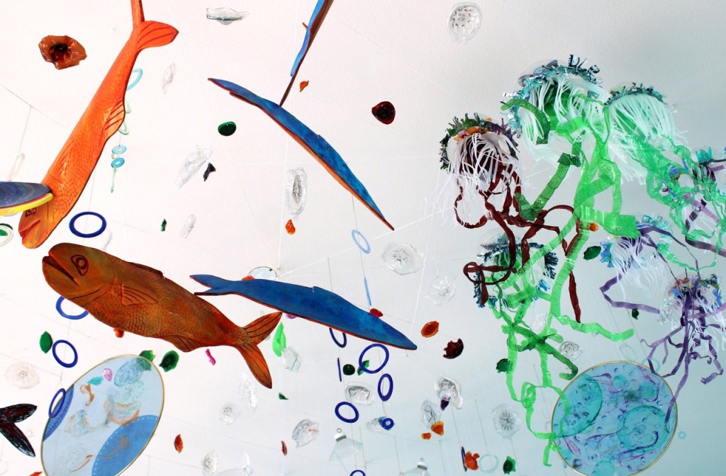 When they walk in, viewers are immersed in an underwater world that presents both playful and wary sea life. Repurposed plastics in the form of painted, wide-eyed PVC fish; hanging strands of medicine-bottle kelp; and intricately cut jellyfish created from liter soda bottles make the space home.