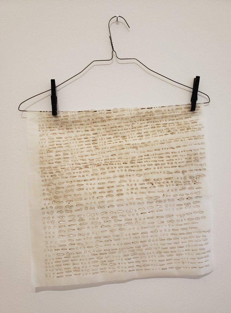In the museum’s entryway, Caroline Kapp’s elemental “Terminal Basins No. 1,” the Best of Show choice, is a toned cyanotype with an art-articulated nature theme: A striped stone serves as protagonist in a composition on a sand-colored grid background divided into nine squares. Other left-of-predictable, pocket-sculptural concepts in the entryway include Colleen M. Kelly’s “Dichotomy of Laundry” — with hangered “laundry” doubling as faux antique scroll and the curiously appealing stuff of Aiyana Cazabat’s series of tiny, spiky plastic bits, suddenly evoking a march of robotic cast-off insects.