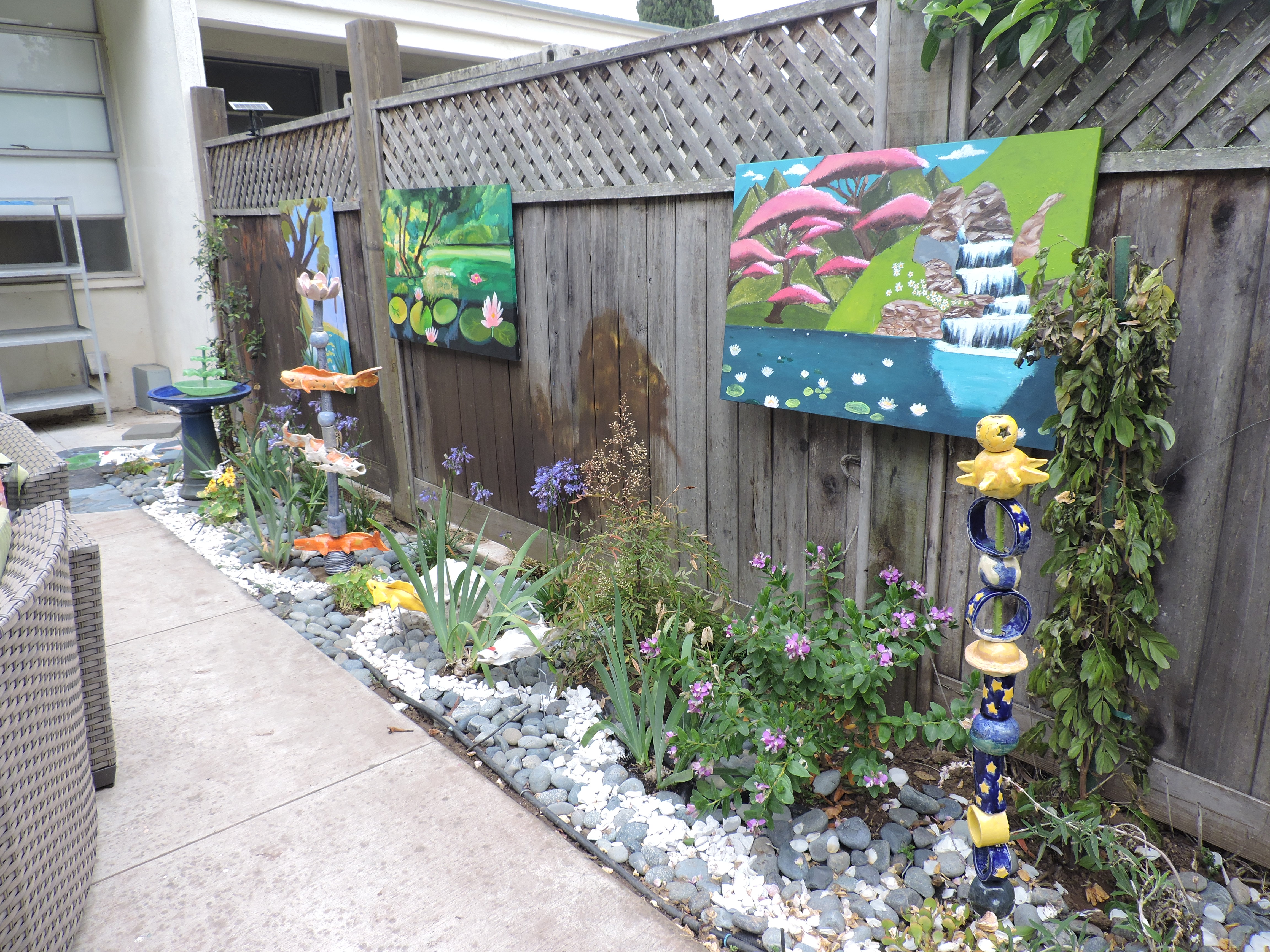 Hundreds of volunteer hours later, it was revived into an art patio with a hand-painted koi mural, individually themed ceramic totems — which took students the full spring 2023 semester to design and craft — shaded areas, landscaping, and a brand-new outdoor furniture set.