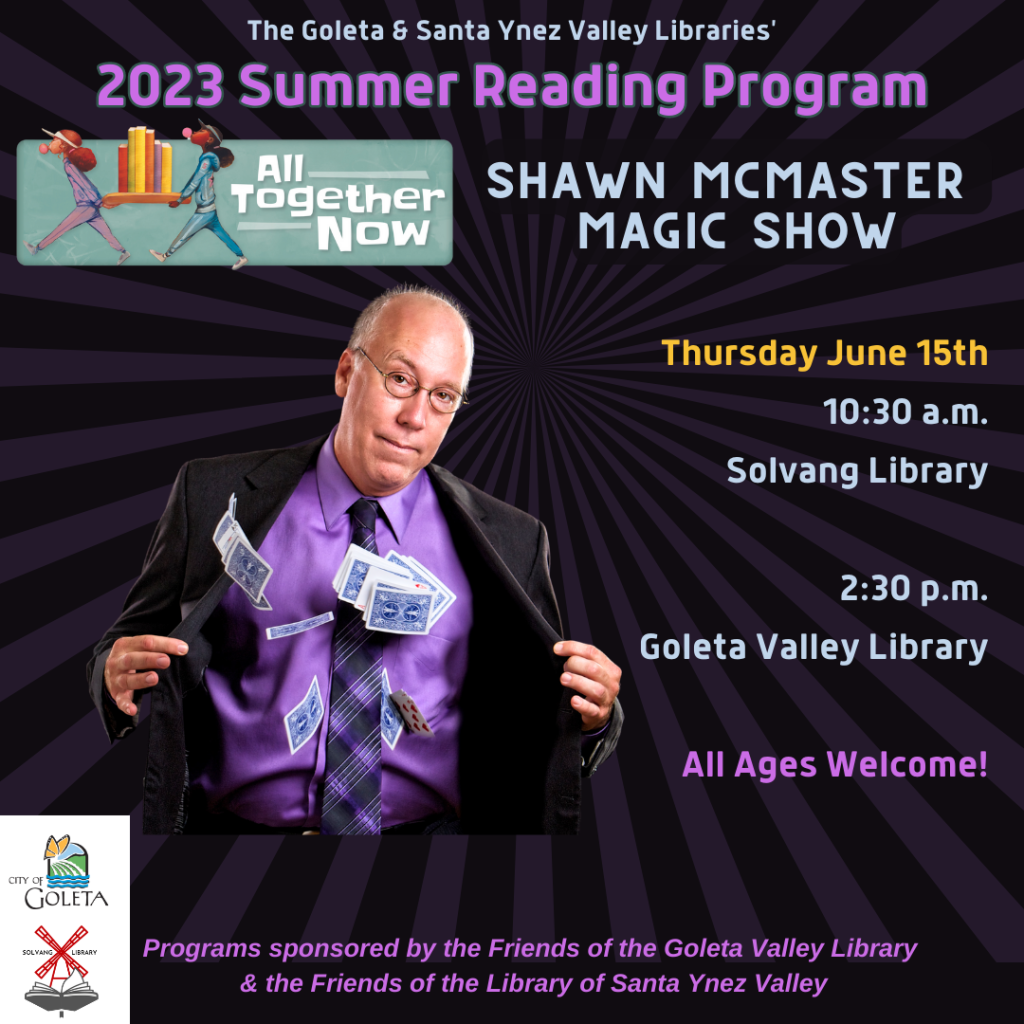 The Summer Reading Program also includes awesome special events for all ages! Each week, programs and special performances will be held across our three library locations. Join us this Thursday, June 15th for a magic show from renowned magician Shawn McMaster! He will be performing at Solvang Library at 10:30 a.m. and at Goleta Valley Library at 2:30 p.m. You’ll be amazed by his show and even learn a few tips for doing your own tricks, too.