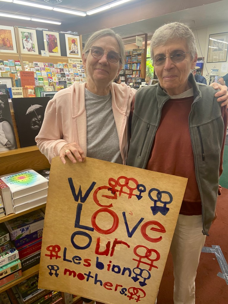 Married couple Joan Ariel and Ellen Broidy came equipped with a sign they’ve marched with for decades, bearing the words, “We love our lesbian mothers.”